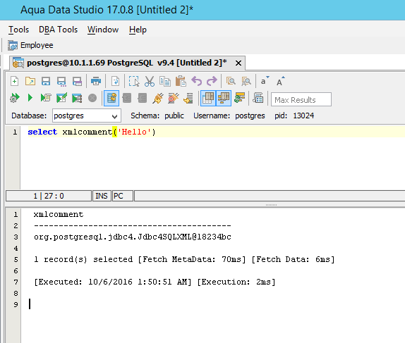 Add support for PostgreSQL XML datatype values in resultsets. You can see results by executing this query and viewing the attached screenshot.