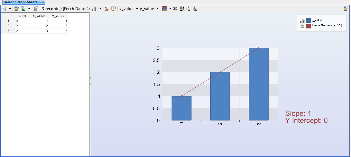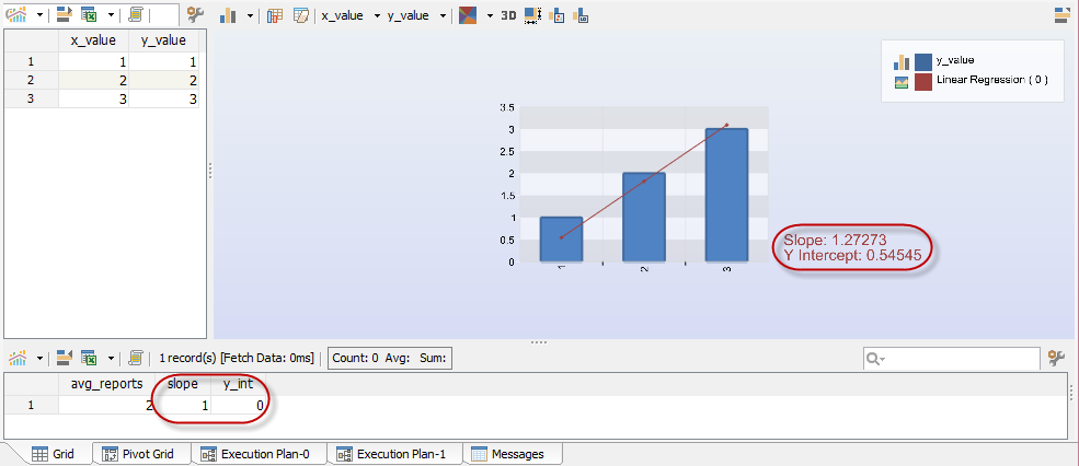 To reproduce the issue, execute the below SQL. A chart will be created w/ the incorrect slope & y intercept values.