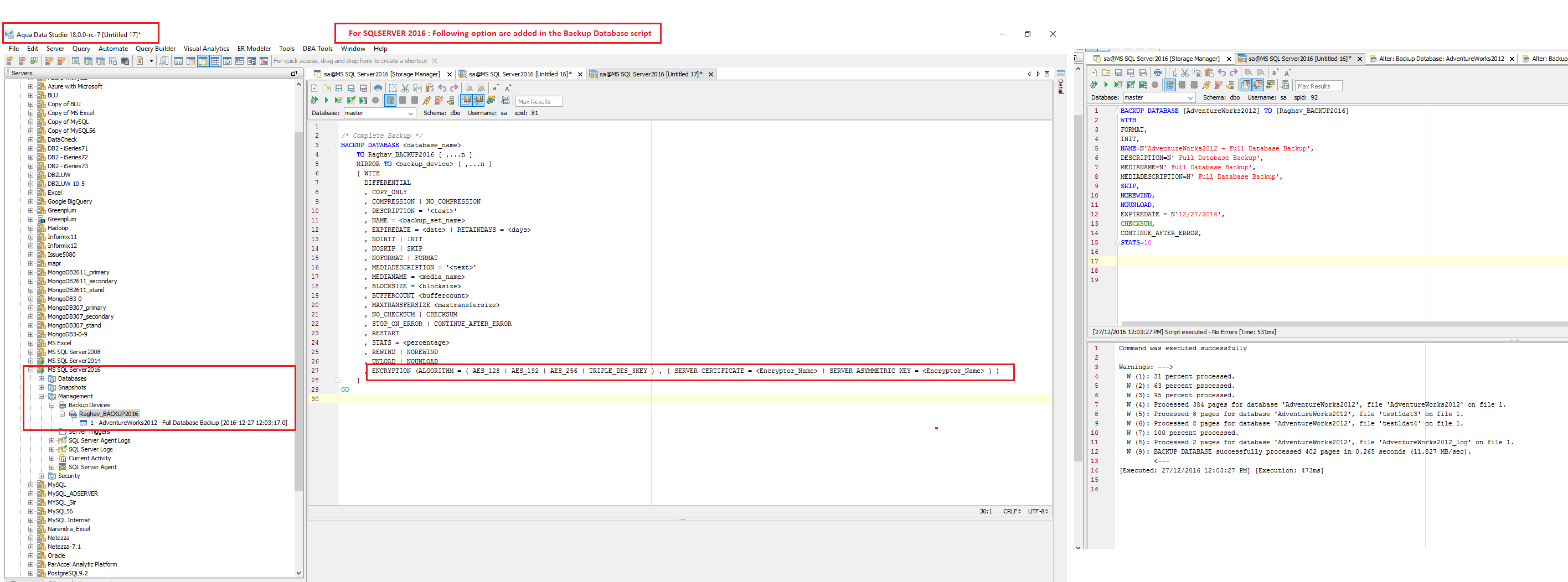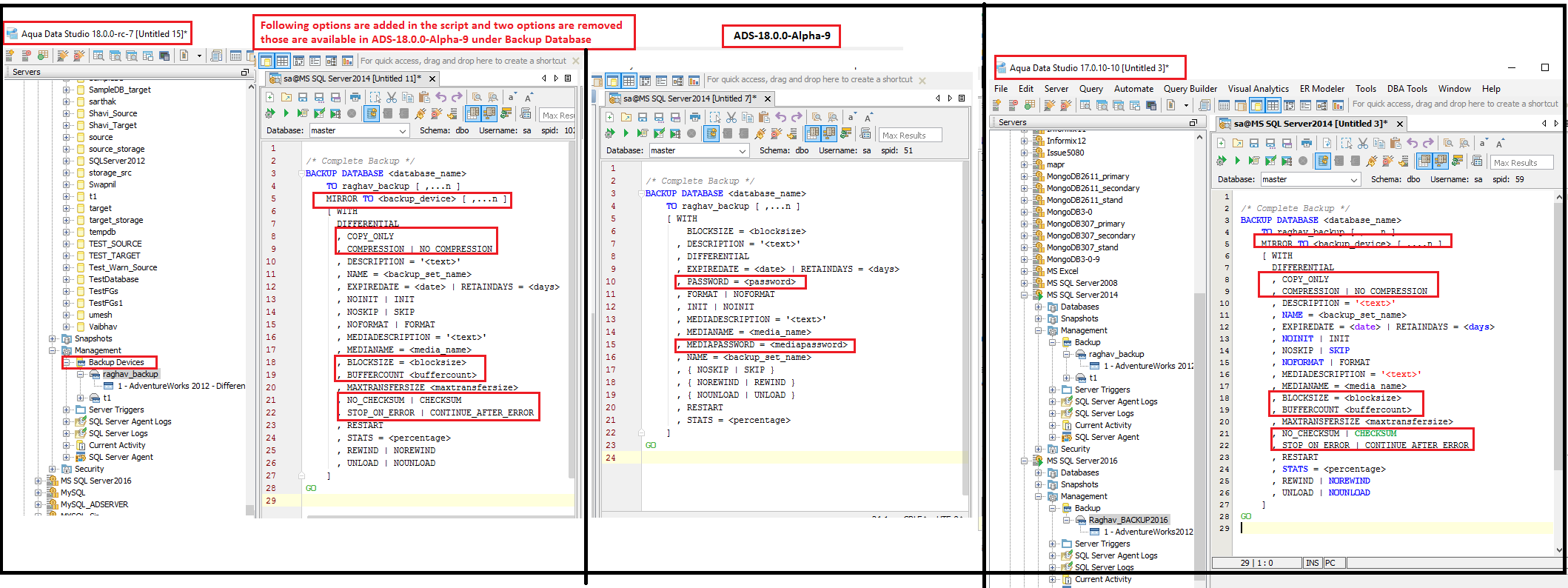 After further analysis, I believe the request is to enhance the scripting of the generic DDL statements to include new syntax for the alter versions of sql server. I can do this quickly and will port code fixes back to version 17. We currently don't have extract/script/GUI support for backup files under the backup device. Also, I would note that our node is called "Backup". This should be renamed to Backup Devices