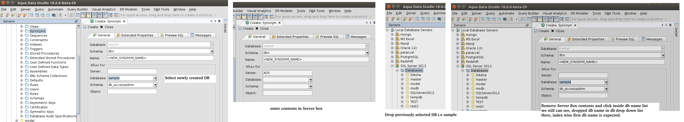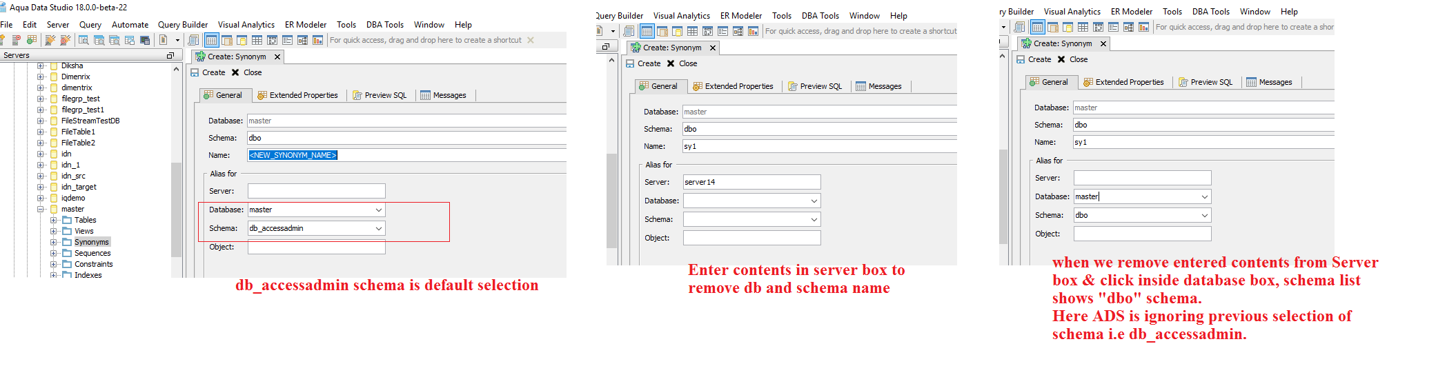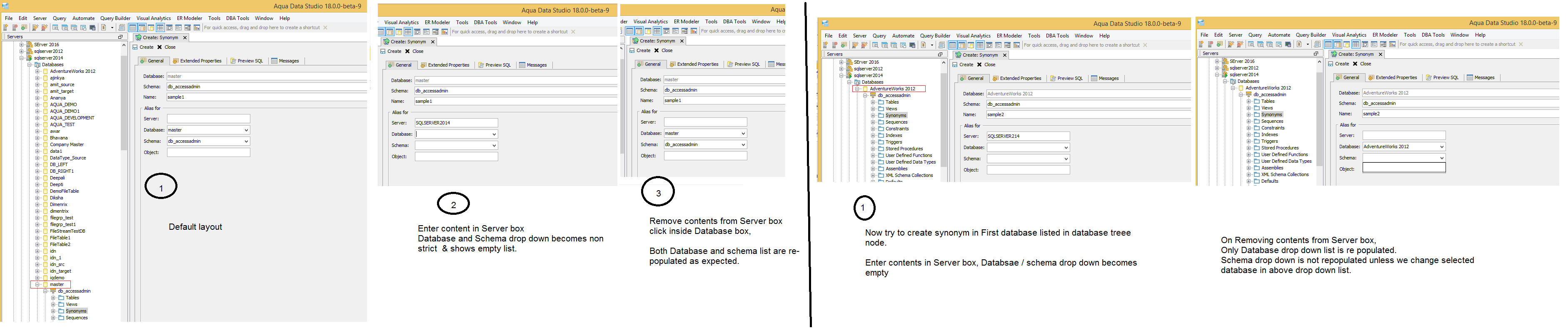 When we enter information into the Server box, the currently selected database and schema is recorded. If you then externally delete the database that was previously selected and then go back to the synonym dialog and remove the server name, when focus is lost the database list is repopulated with the database list. This database list is not extracted from live data but we stored it on dialog load. The list is then set to the previously selected database, which no longer exist. When this selection occurs, we do attempt to extract the information from the database for the schema list. Here you will see a sql executed in the sql log that fails. This is because the database no longer exists and so the schema box will only get populated with 'dbo'. So in the case that the database no longer list, the database itself will still be set to the previously selected, even though it doesn't exist anymore but the schema will be set to 'dbo'.