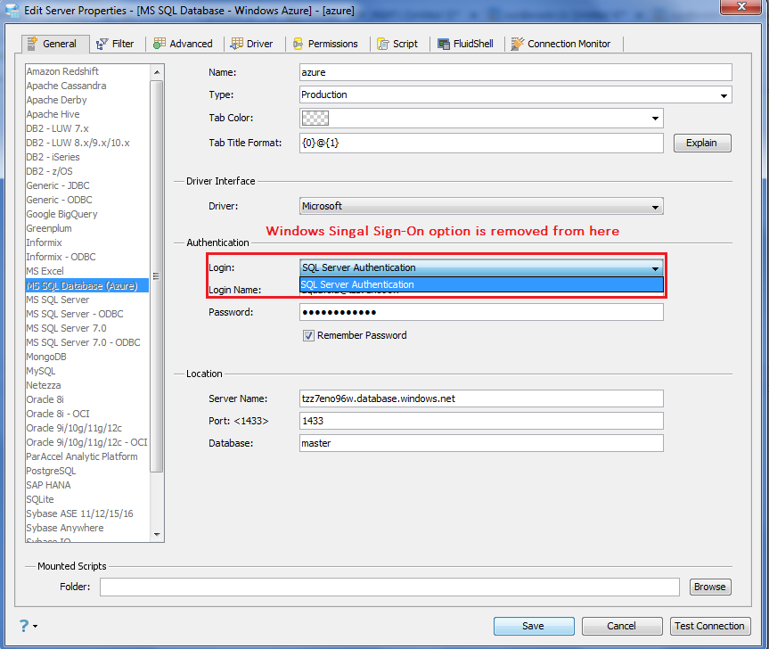 @tom: In Server Registration, for Azure DB -> MS JDBC Driver, remove the "Single Sign On" option. This should not be offered, just like we don't offer it for jTDS driver.
