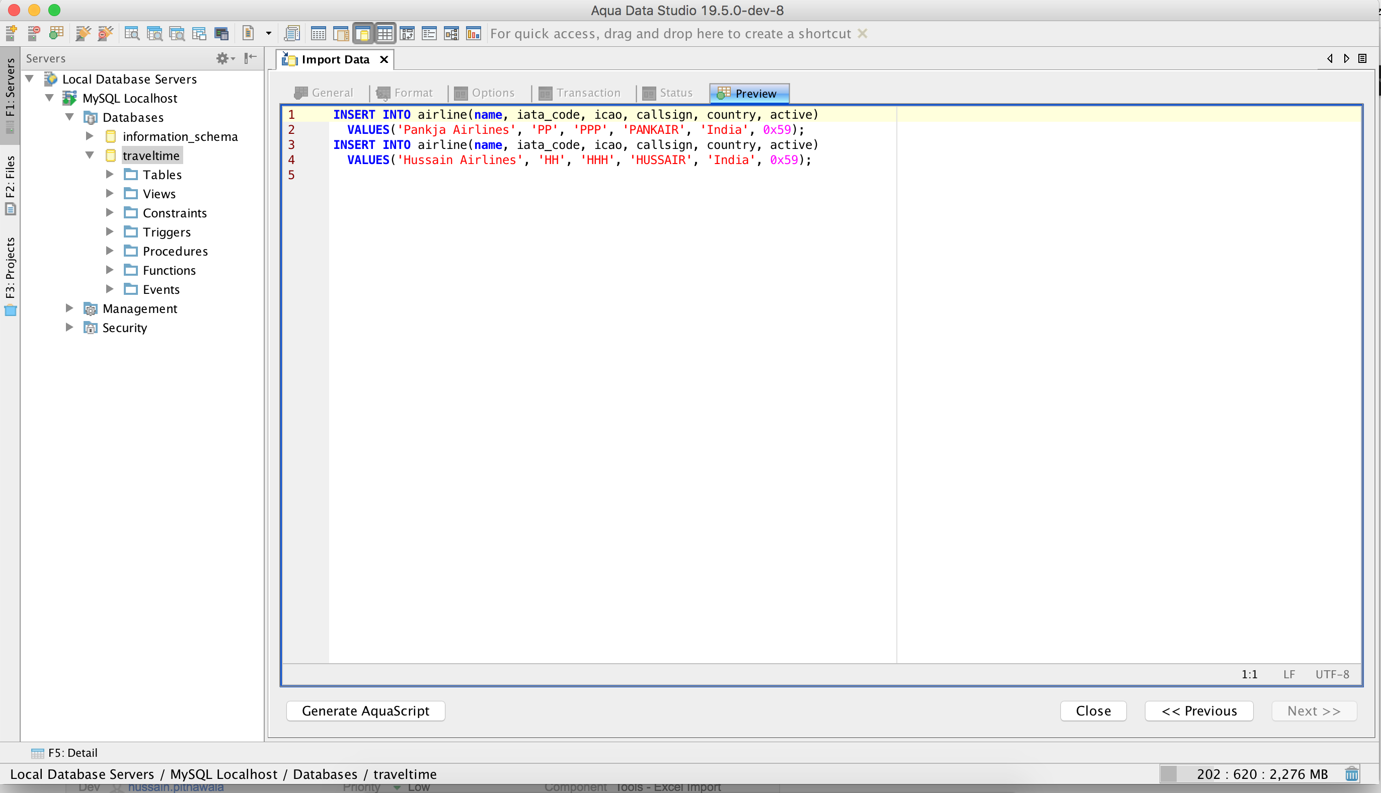 Results should be visible. In case, you have selected "Preview statements" in the "Options" tab. Generated statements should contain the corresponding constant values.