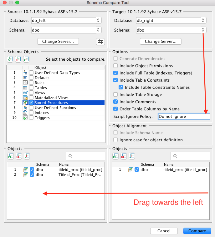 2. Make the Schema Compare Tool window smaller by dragging towards the left