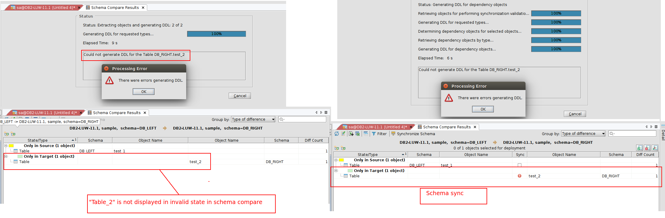 "Schmea Compare Results" panel created by "Schema Compare Tool" dialog currently does not provide a way to visually indicate objects in invalid state. I have logged a separate enhancement request for this, see ADS #15081.