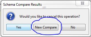 In ADS 17 (and maybe some older versions) there was a "New Compare" button in the "Schema Compare" tool, this button seems to have been removed in ADS 18. This button was somewhat hidden, the only way to get to it was to click the refresh button in the "Schema Compare Results" windows, then press the "Cancel" button on the "Status" screen at which time a dialog box would come up (see attached) with a "New Compare" button. If you were able to click this "New Compare" button before the refresh finished the "Schema Compare Tool" dialog would appear with the original source/target database connections as well as the selected objects. I would use this to adjust (add/remove) objects from the comparison without having to start from scratch with the wizard. Maybe I'm missing a setting which turned this feature off. It would be nice to have this button back in ADS 18 and it would be even nicer if this button was put next to the refresh button on the compare results toolbar.