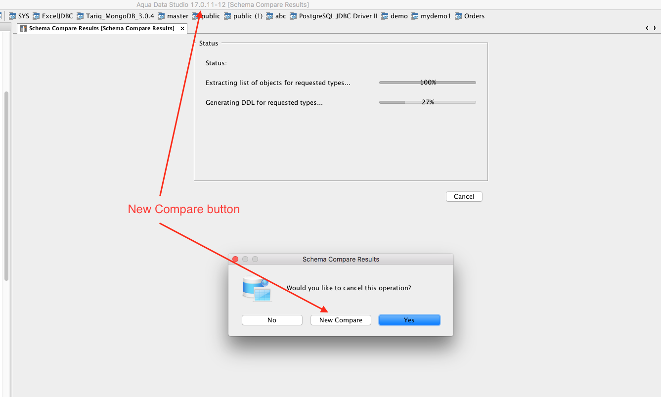 There are 2 ways you can cancel a Schema Compare operation. One is select the 2 Schemas to be compared, select the Schema Objects and click on the Compare button. In the Schema Compare Results window, you have a Cancel button and when user hits Cancel - A cancel operation with 3 buttons No, New Compare and Yes is displayed. This works fine in both ADS v17 and ADS v18