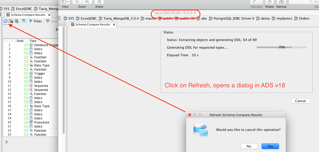 Next way to cancel a Schema Compare is to run the operation to completion and the results come up. Next hit the Refresh button, a new compare starts and hit on Cancel and with ADS v18.0 the cancel operation has only 2 buttons No and Yes. In ADS v17 there are No, New Compare and Yes.