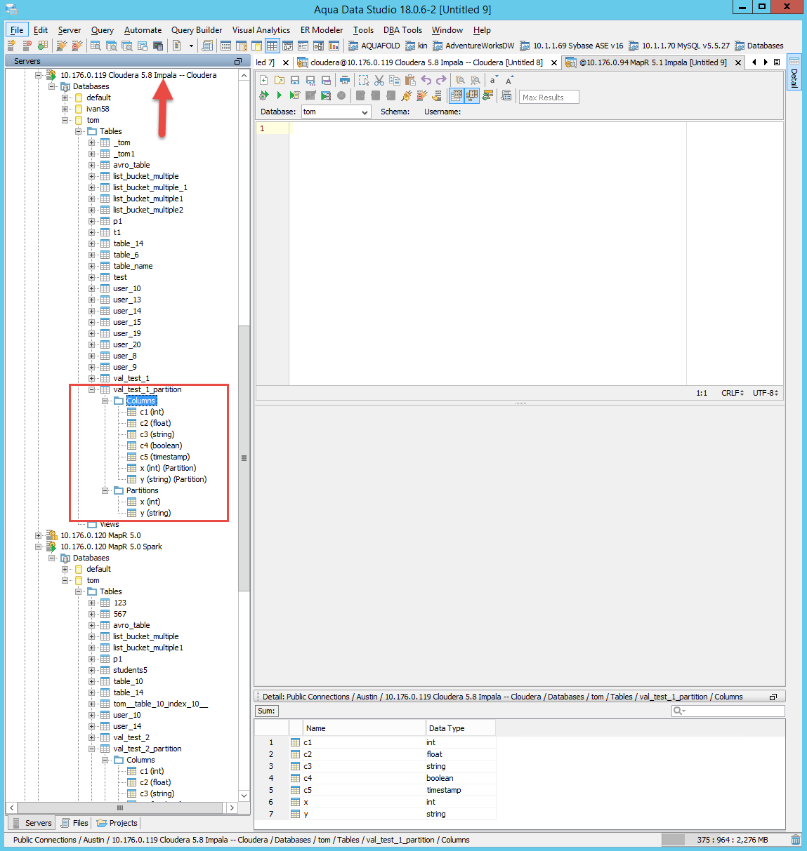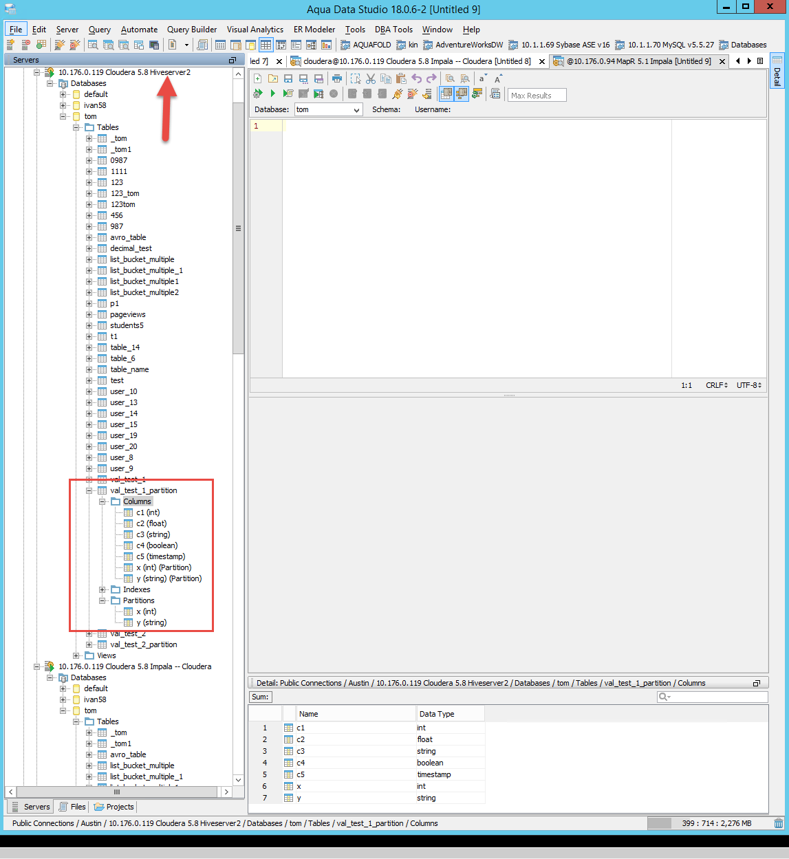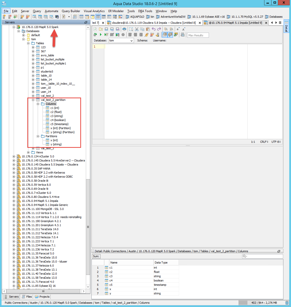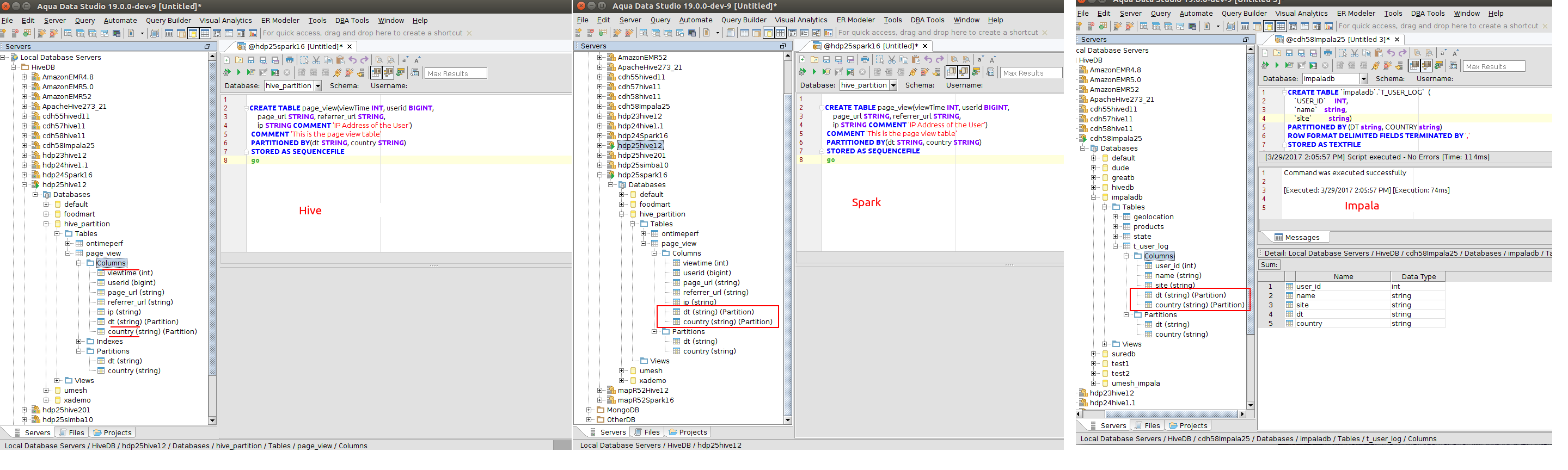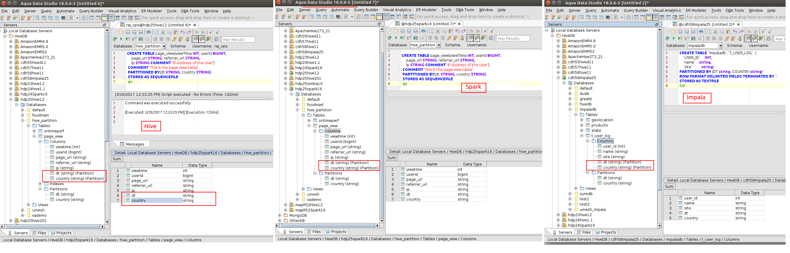 Please see attached screenshots of Hive, Impala and Spark partitions displayed in the schema tree column node and detail view. Please test this scenario across different distributions and connection types and make sure partitions are displayed correctly. Also, test if a table does not have any partitions. Make sure the columns are displayed correctly.