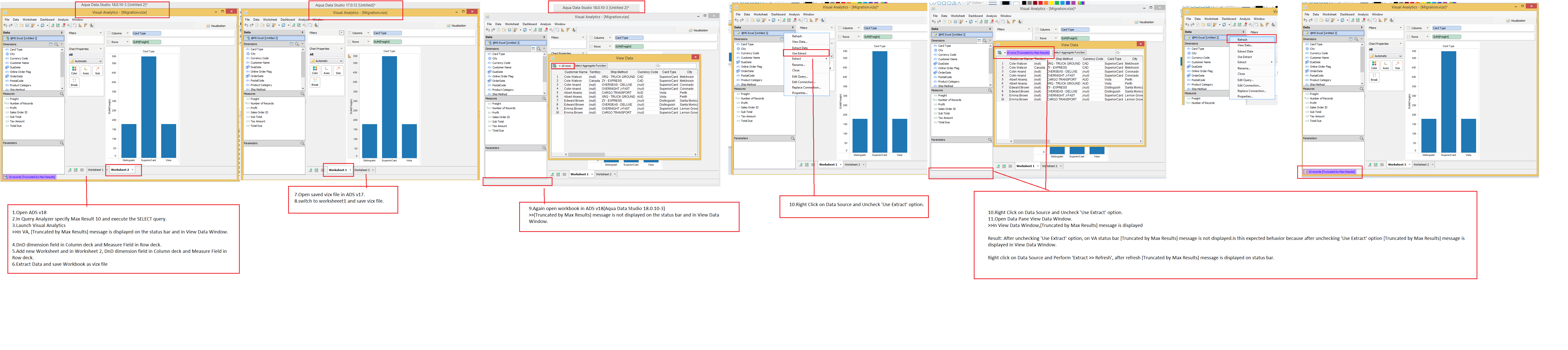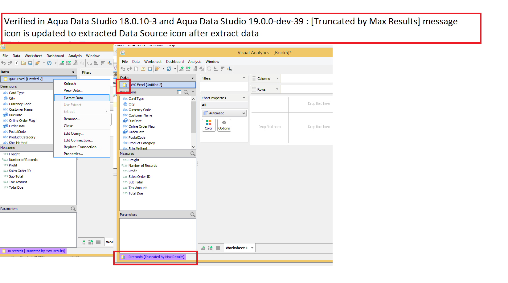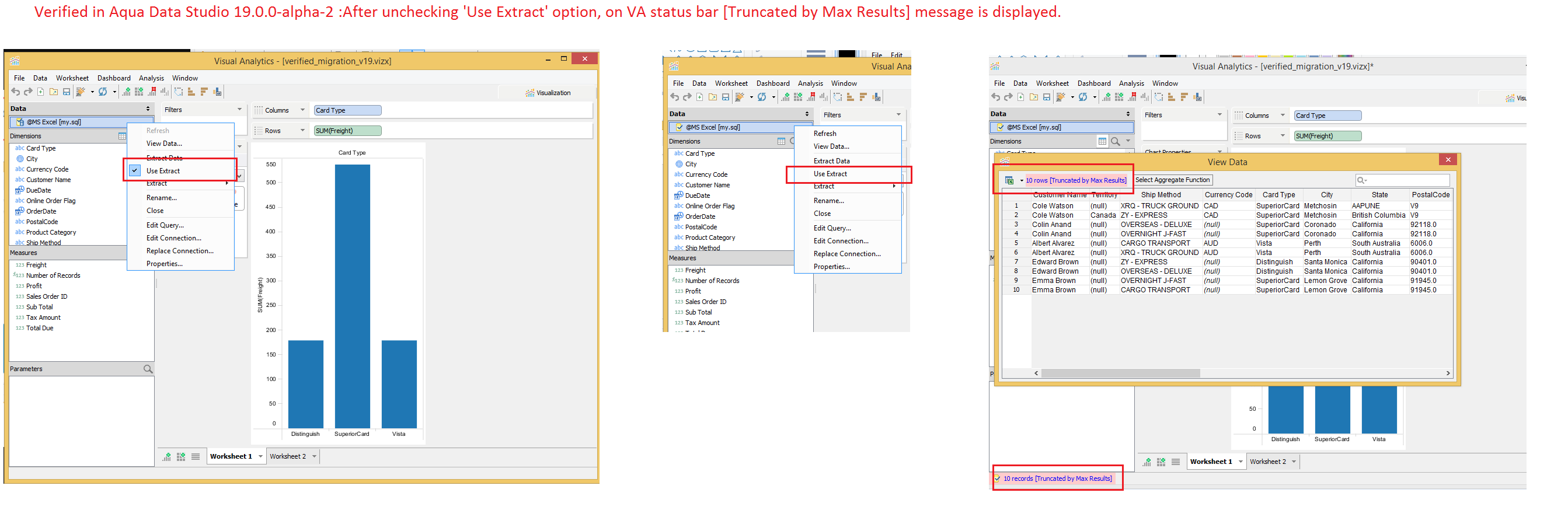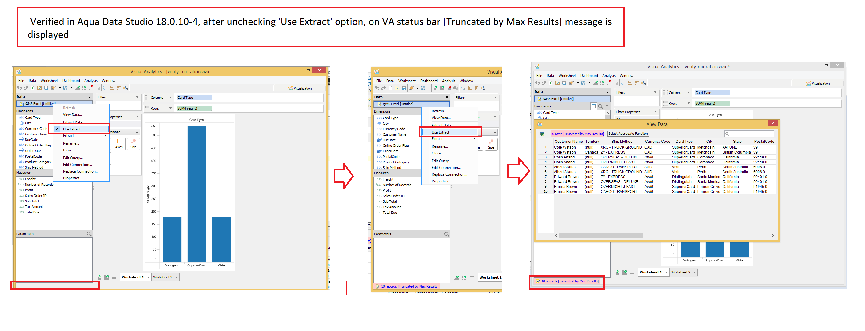 Verified in Aqua Data Studio 19.0.0-alpha-2 : Verified migration scenario mentioned in this comment ,After unchecking 'Use Extract' option, on VA status bar [Truncated by Max Results] message is displayed. (Please refer screenshot verified_migration_v19.png and verified_migration_v19.vizx)