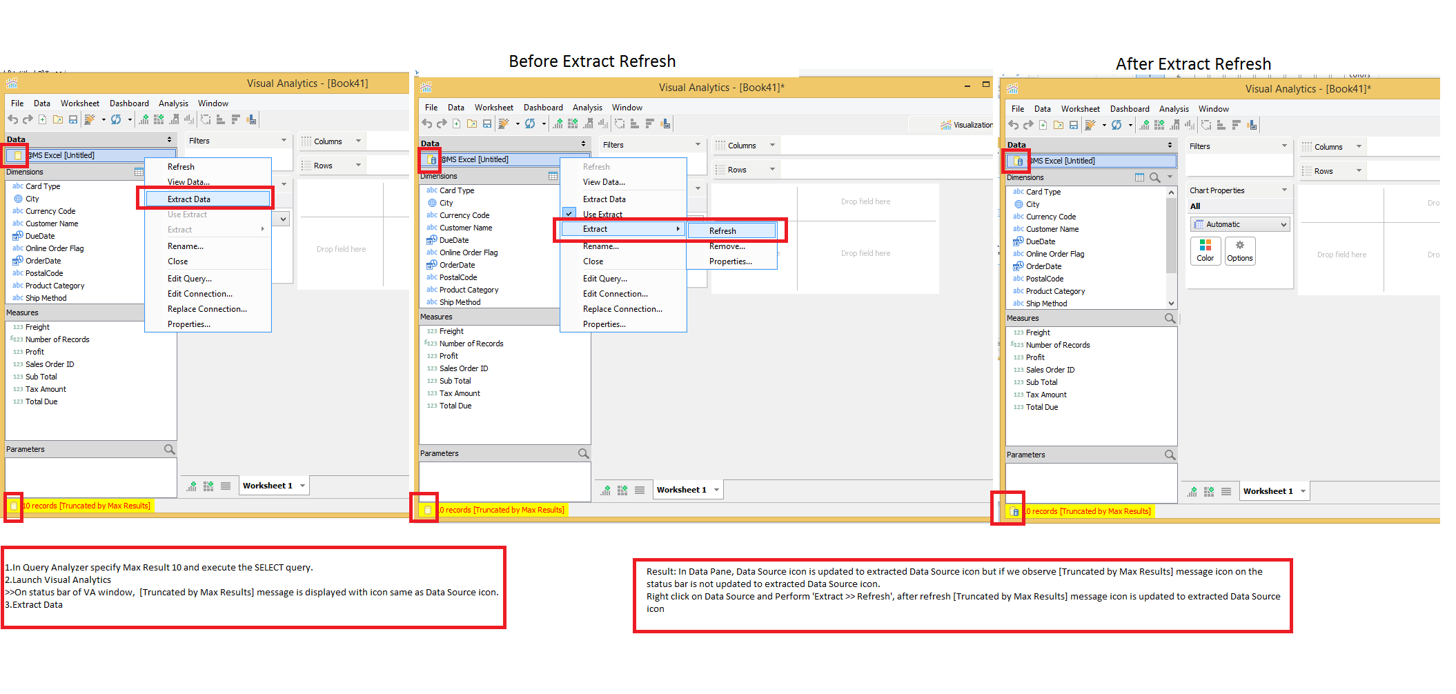 When I extract data from a datasource that was "Truncated by Max Results", save as packaged workbook, and reopen the vizx file, the "Truncated by Max Results" is not being shown. Not sure what's expected here, but IMO it should be shown because when I refresh the extract, the "Truncated by Max Results" is shown. [SP] Agreed, it should be shown