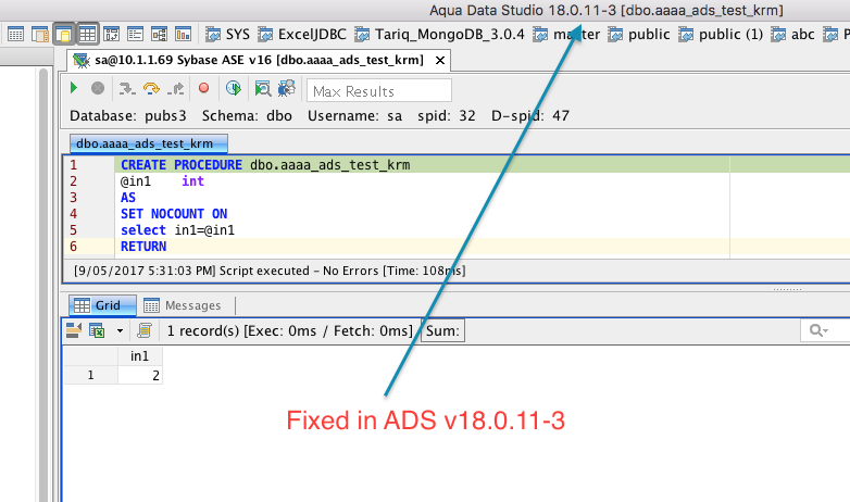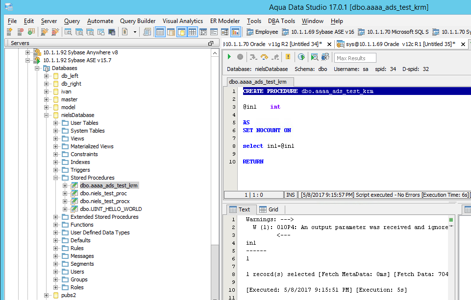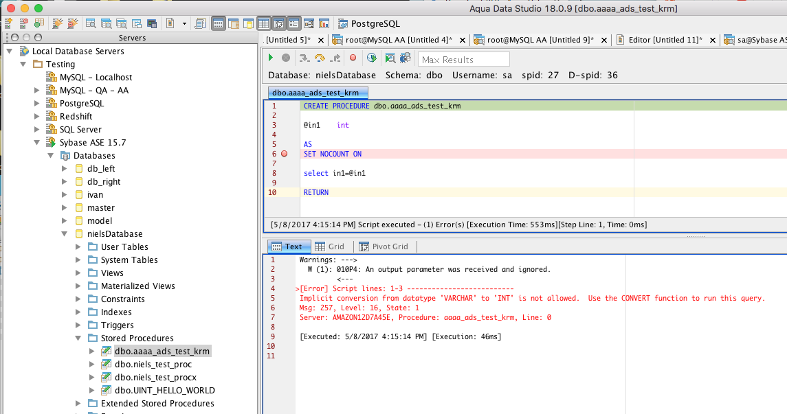 Create following procedure on Sybase ASE 15.7 and then try to debug with value "1". It fails in ADS 18.0.9, while it works in ADS 17.0.1