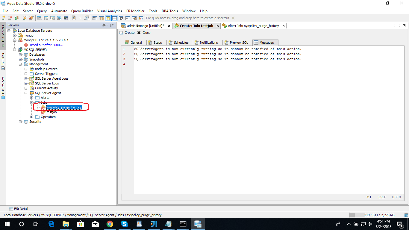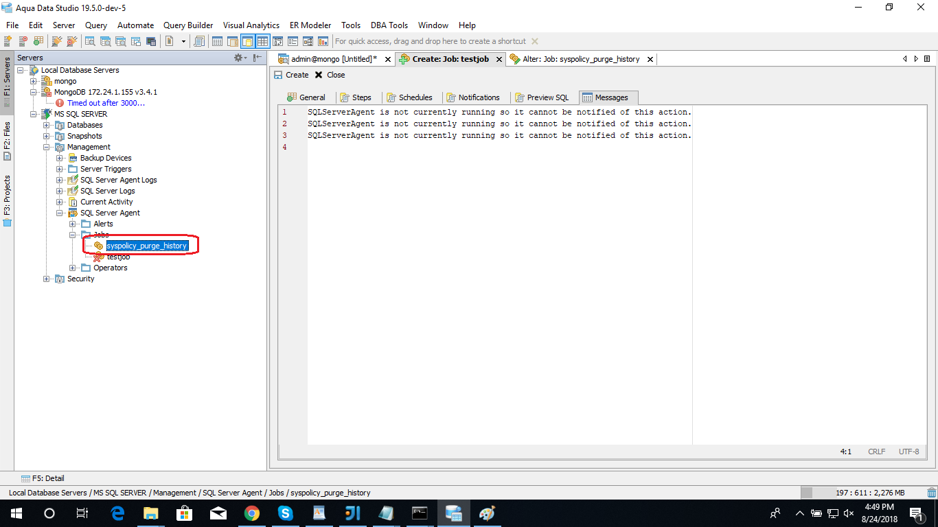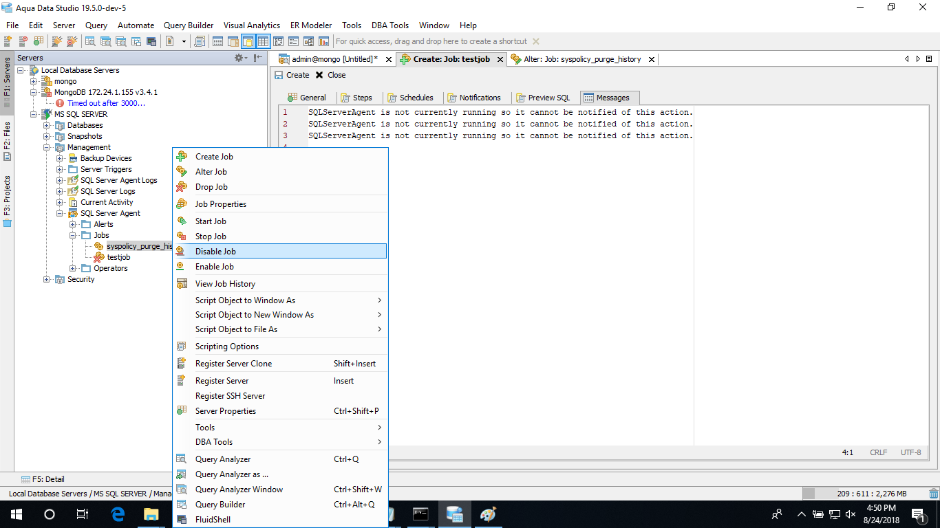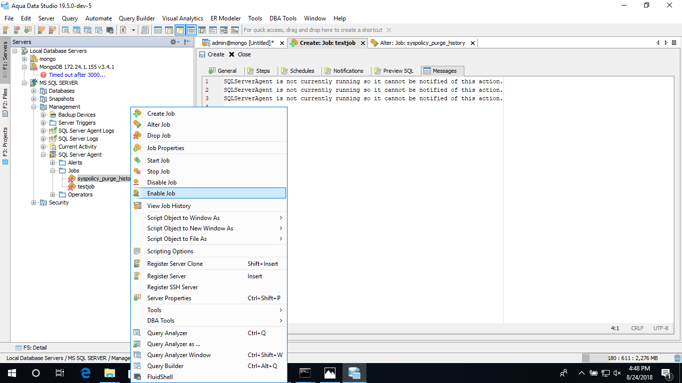 I started the SQL Server Agent on the 2016 SQL Server(SQL Server 172.24.1.199 2016). You should be able to create a test job and disable it. See screenshot.