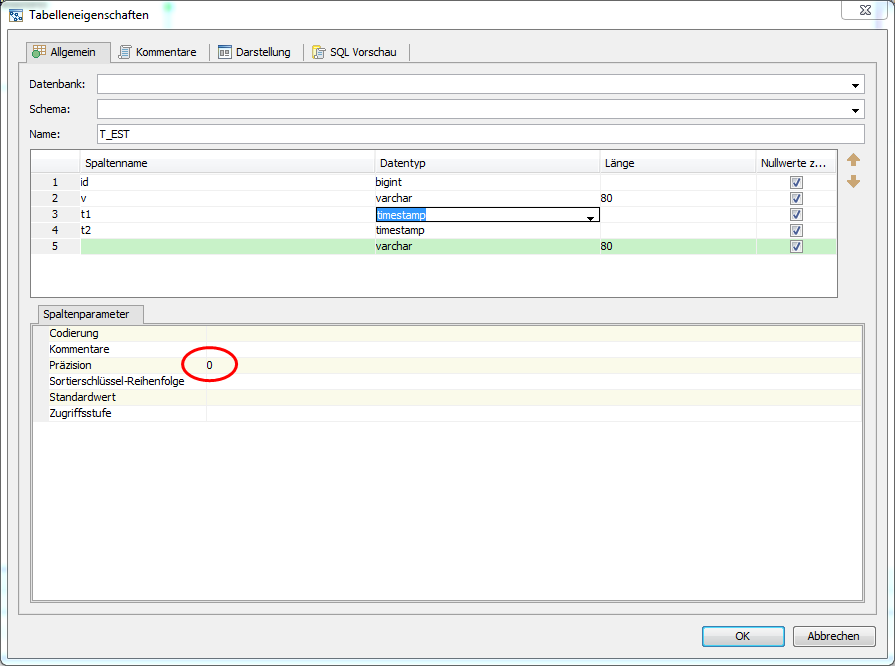 To reproduce this issue, create a new diagram and a new table on that diagram. Add a Timestamp column and remove the precision. Save and closet the diagram. Open it again and check the Timestamp precision.