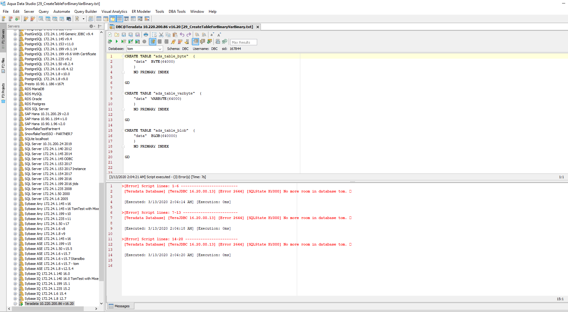 There is issue with Teradata. It has error like "No more room in database tom"