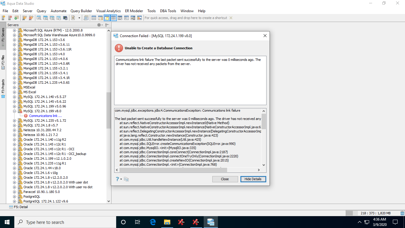 I am unable to connect to "MySQL 172.24.1.199 v8.0". Error screenshot.