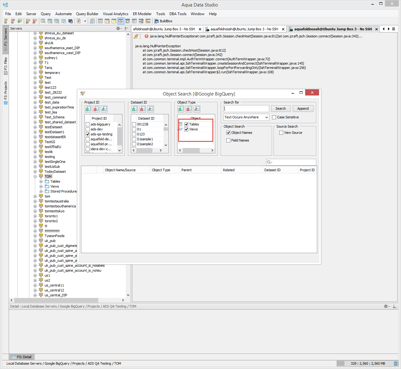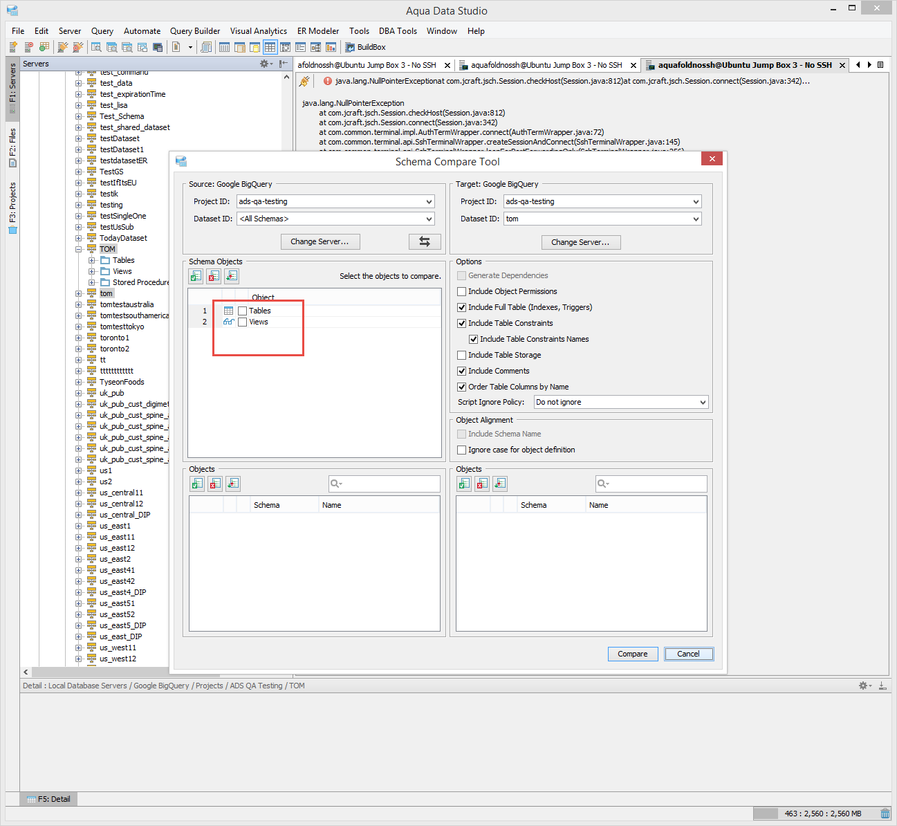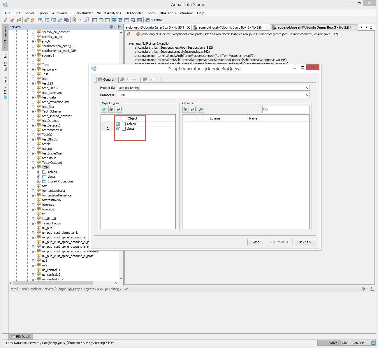 Given this scenario, I am getting a npe I believe because of empty result set. Please have a look. Also, seems like when I do a create or drop using script in the QA window, the grid results window has focus and is empty instead of the message window having focus. Please check that out.