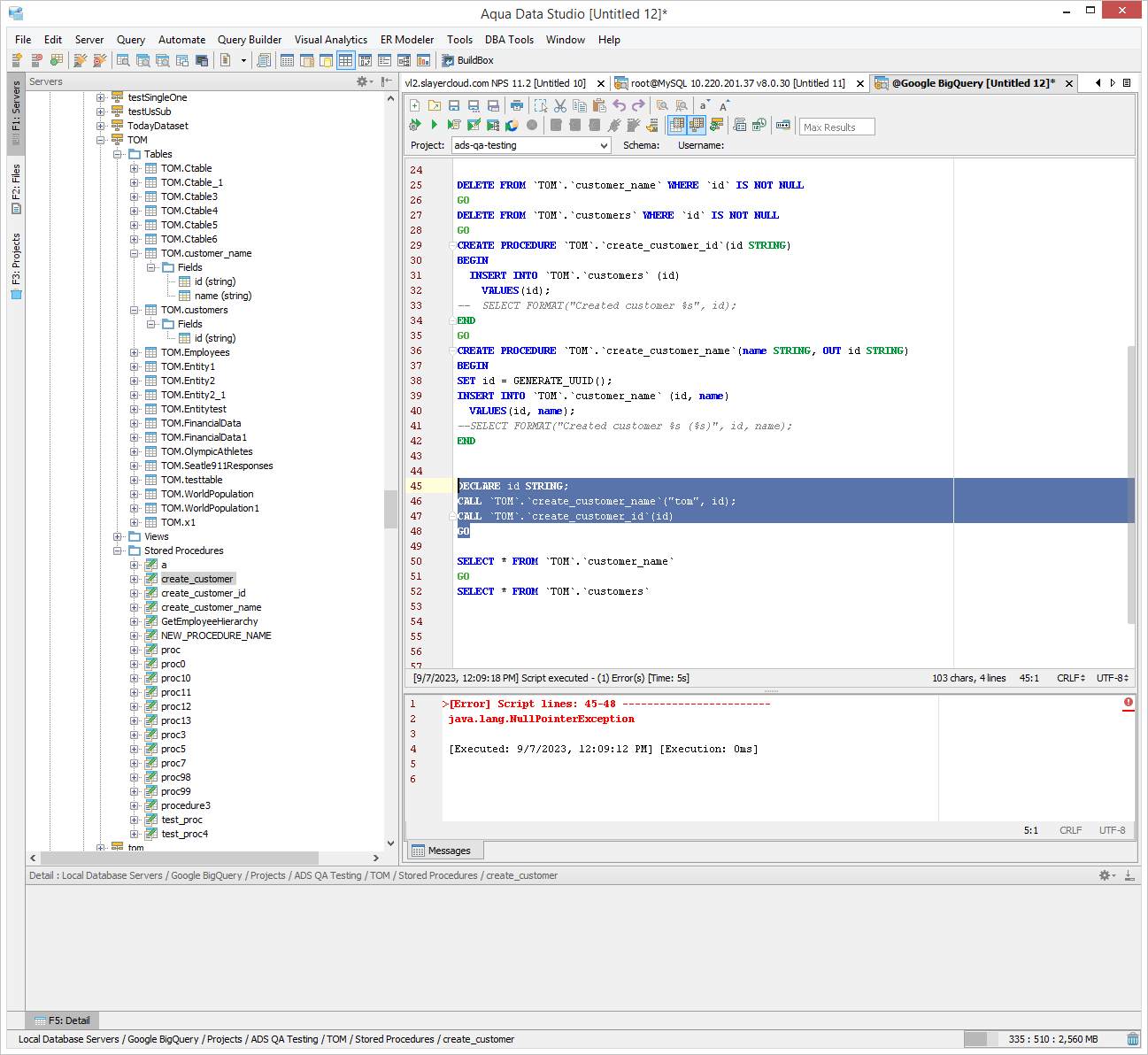 DELETE FROM `TOM`.`customer_name` WHERE `id` IS NOT NULL GO DELETE FROM `TOM`.`customers` WHERE `id` IS NOT NULL GO CREATE PROCEDURE `TOM`.`create_customer_id`(id STRING) BEGIN INSERT INTO `TOM`.`customers` (id) VALUES(id); -- SELECT FORMAT("Created customer %s", id); END GO CREATE PROCEDURE `TOM`.`create_customer_name`(name STRING, OUT id STRING) BEGIN SET id = GENERATE_UUID(); INSERT INTO `TOM`.`customer_name` (id, name) VALUES(id, name); --SELECT FORMAT("Created customer %s (%s)", id, name); END DECLARE id STRING; CALL `TOM`.`create_customer_name`("tom", id); CALL `TOM`.`create_customer_id`(id) GO SELECT * FROM `TOM`.`customer_name` GO SELECT * FROM `TOM`.`customers`