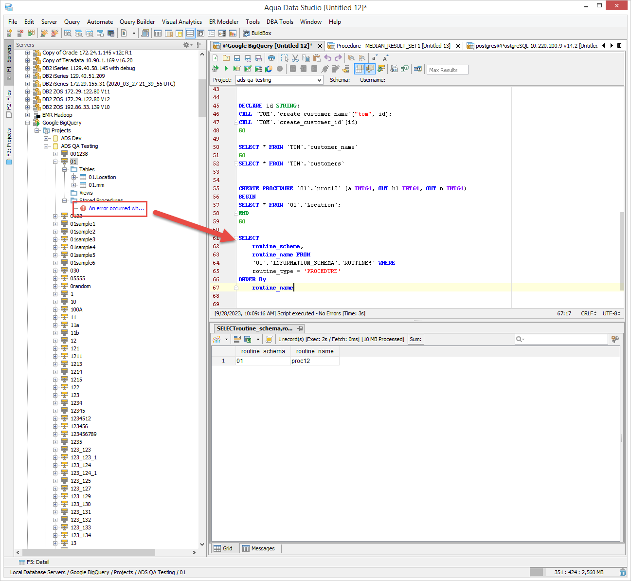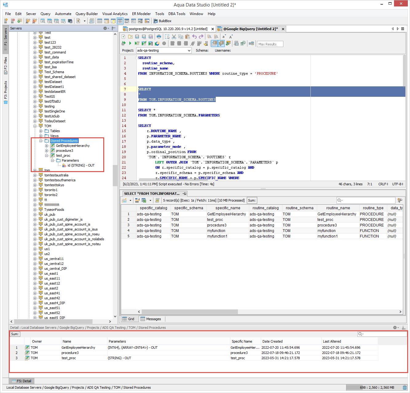 Stored Procedures were recently added to the Google BigQuery platforms and need to be added to ADS. I added a patch with the start of implementation. Comments in the code show additional pieces that have to be implemented such as scripting, create/alter/drop/properties and parameter detail. Additionally, more details should be provided for the procedure list in the detail window.