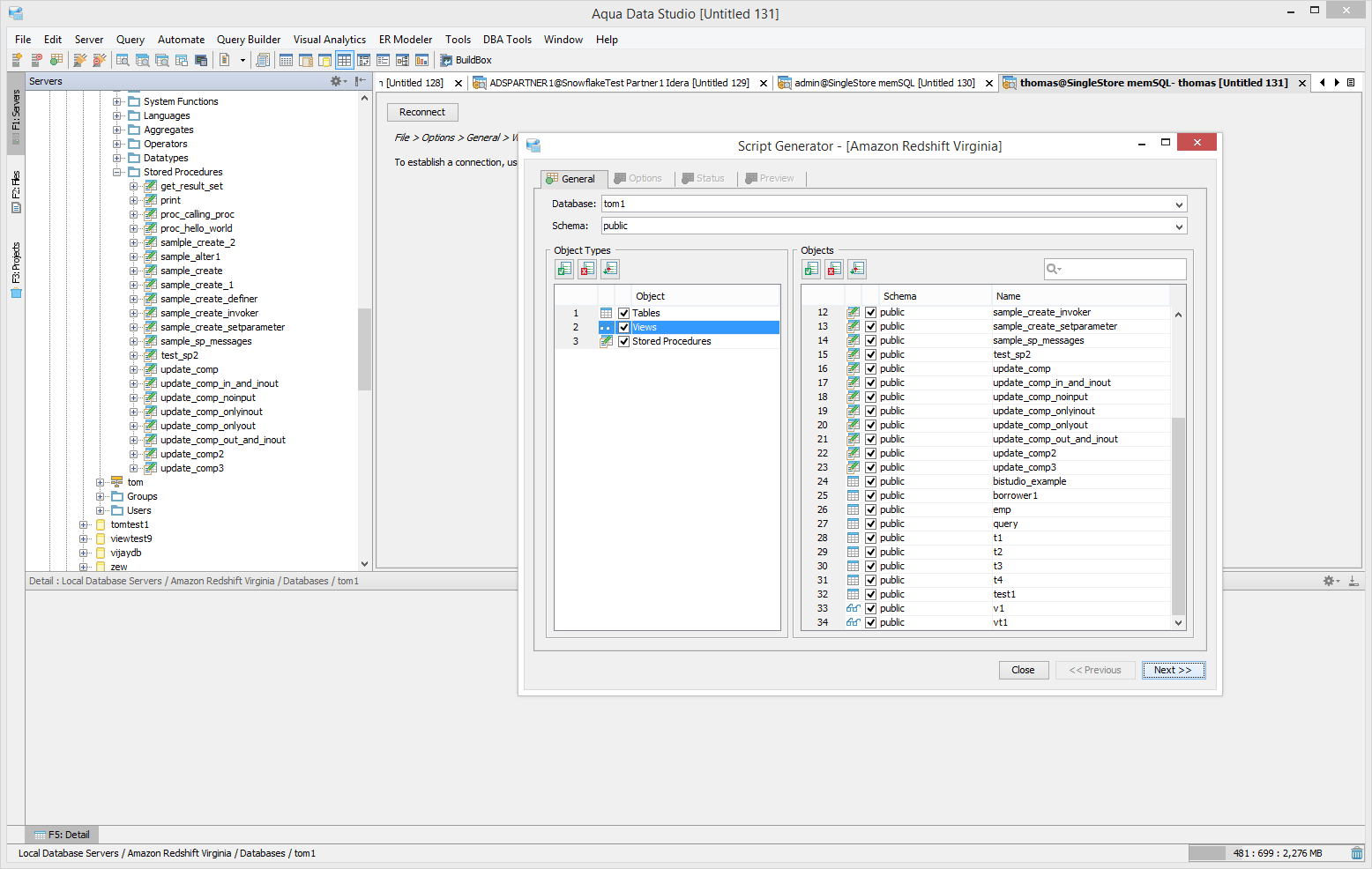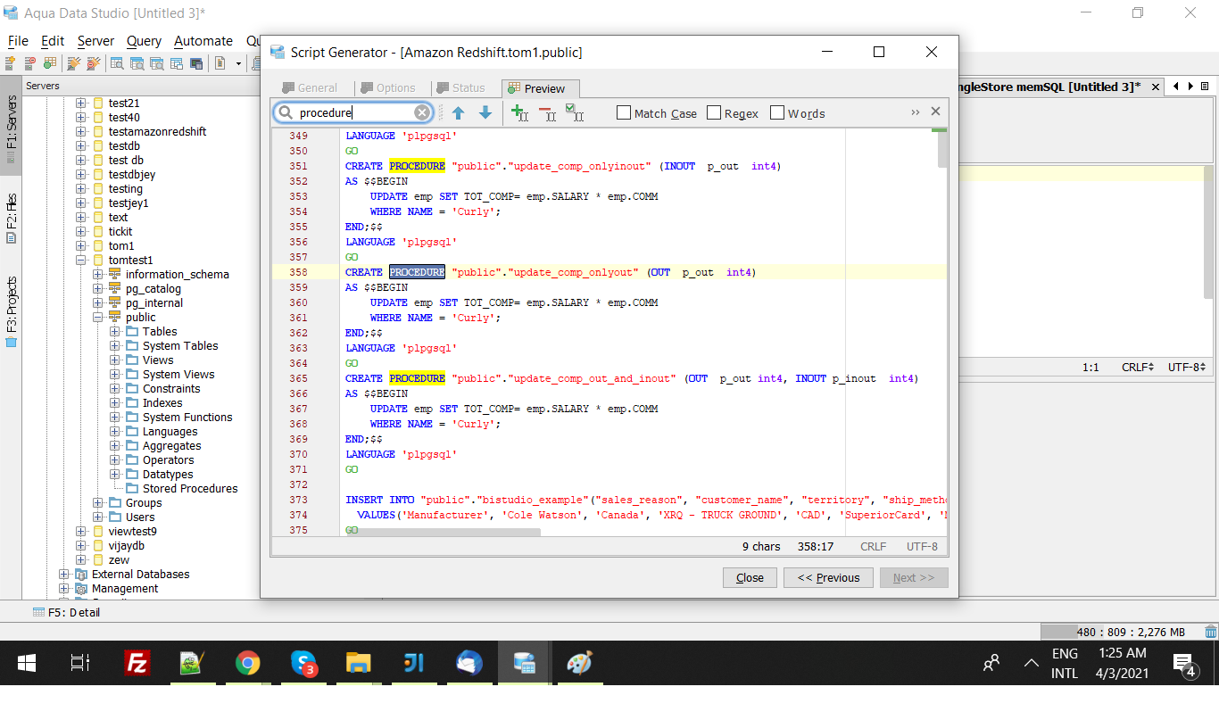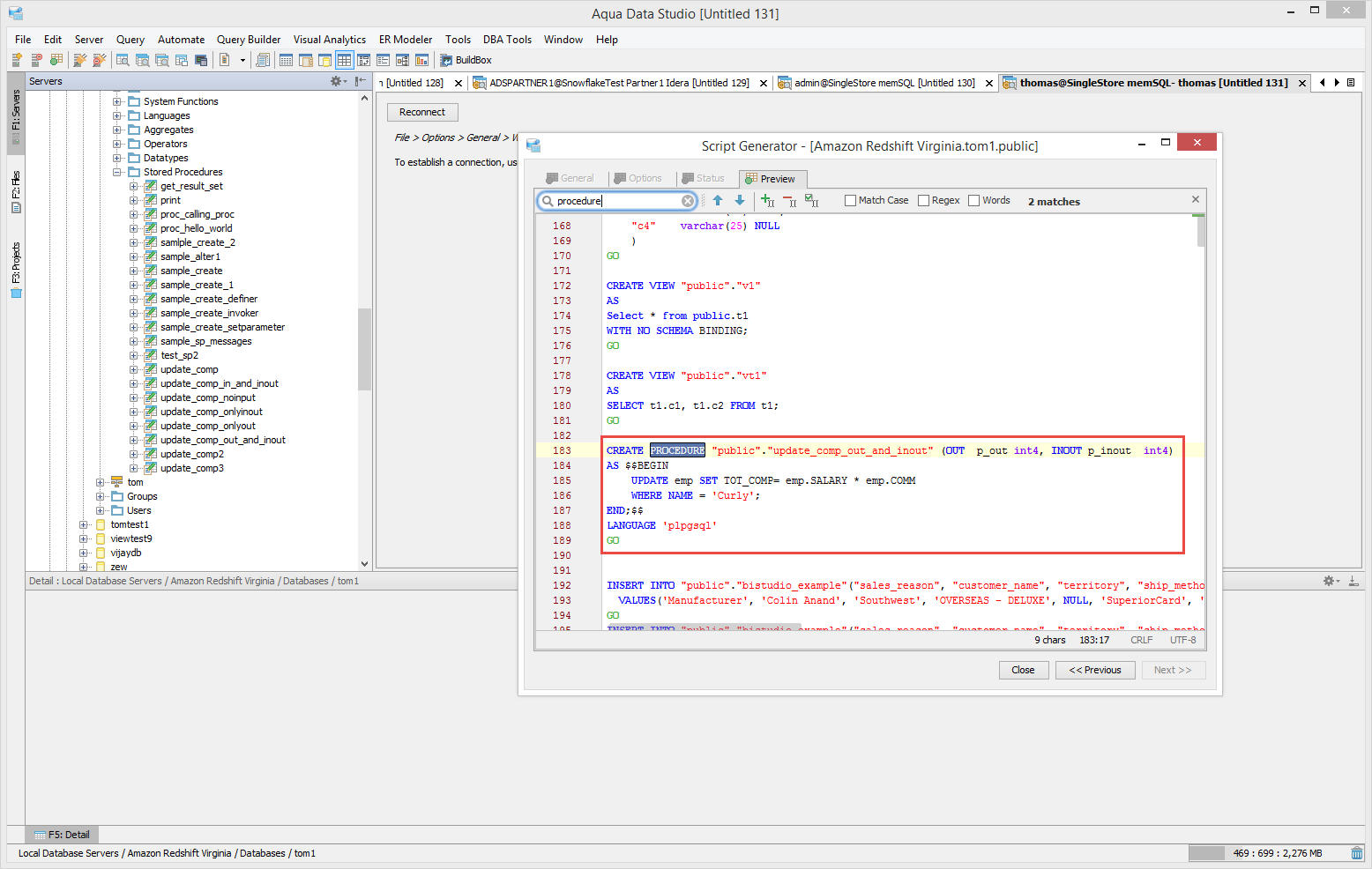Stored Procedures were recently added to the Amazon Redshift platforms. Aqua Data Studio needs to support stored procedure objects.