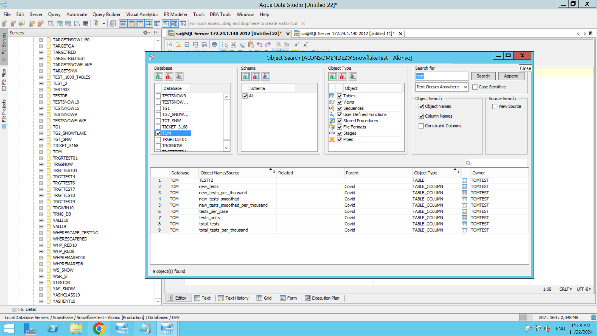 Object Name/Source, Object Type, Parent, Related, Owner, Database.