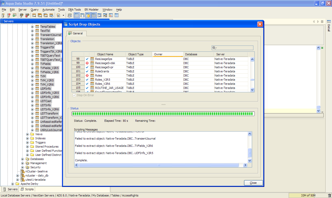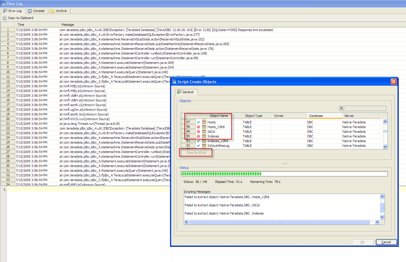Stop on Error doesnt work in ADS build 7.9.51. I get the below errors now. When I close ADS and restart and do a script, the error doesnt occur. But after that any repeated attempts will cause the below errors