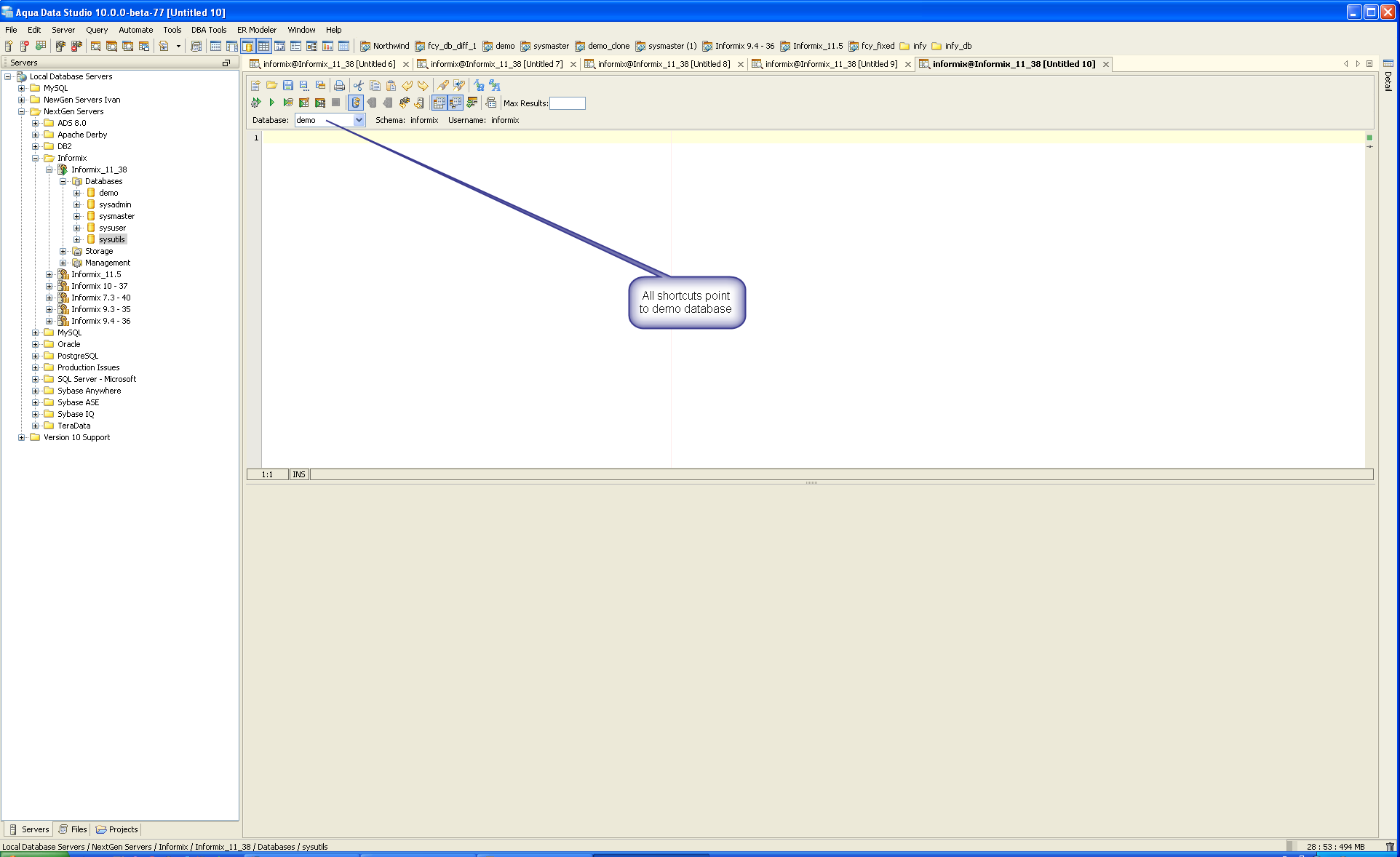 2. double click on the server node to open a query window - the database is demo (correct)