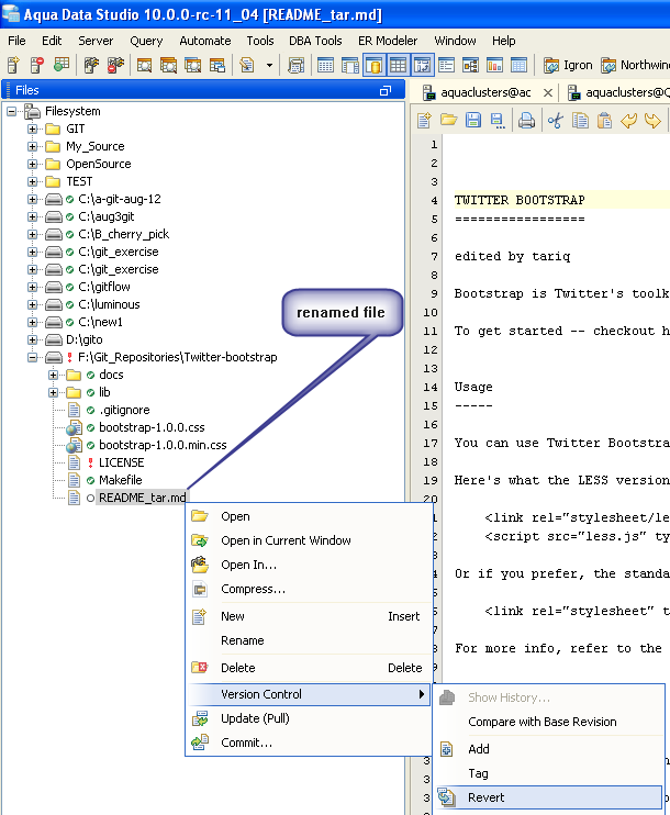 Then if I select the newly renamed file, right click and select Version Control --> it should have Revert disabled