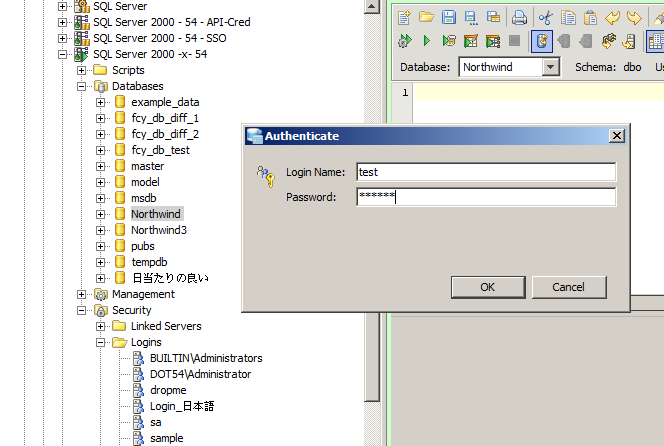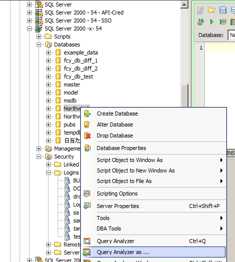 However, right-clicking on a server node and selecting Query Analyzer As... produces an Authenticate dialog. If I enter an (invalid) username and password, the exception tells me "Login failed for user x" where X is the user name entered on the dialog. Unless other steps are involved, I am unable to reproduce.
