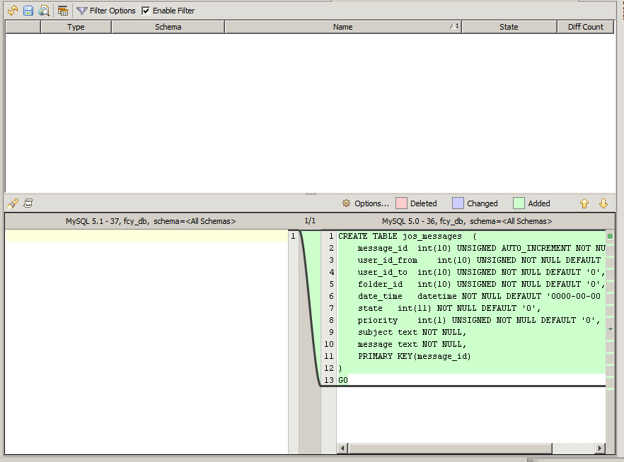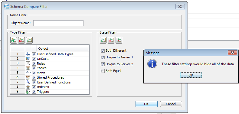 Schema Compare filter should show empty list if filter results are empty. It should not display a message as in the screenshots.