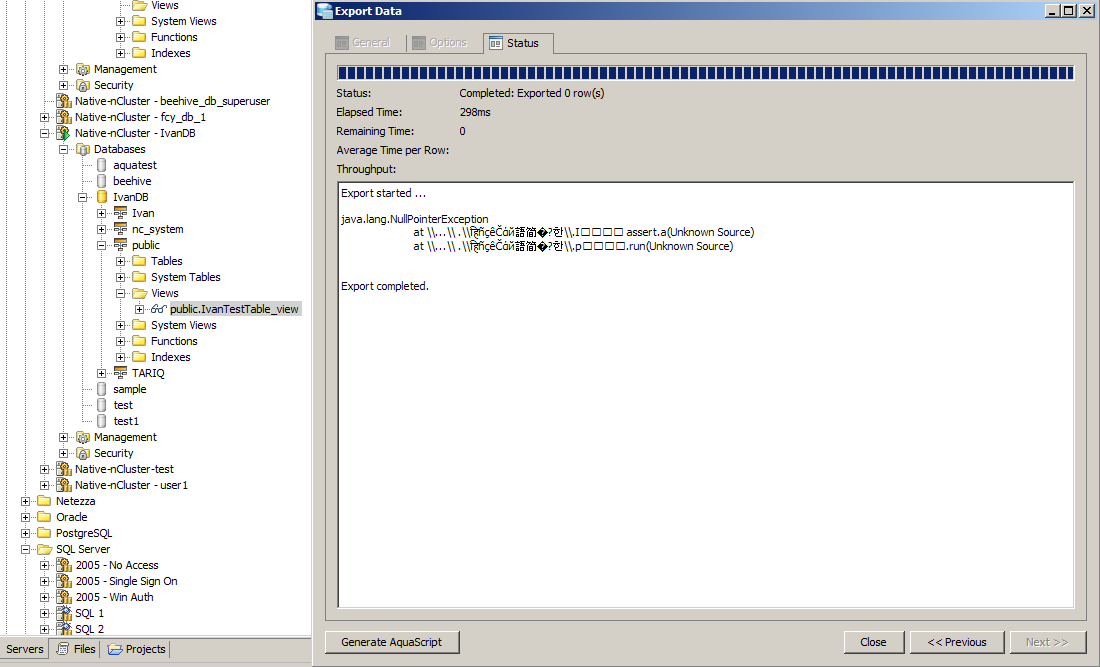 Export View on nCluster - IvanDB -> public.IvanTestTable_view and you will get a Null Pointer Exception