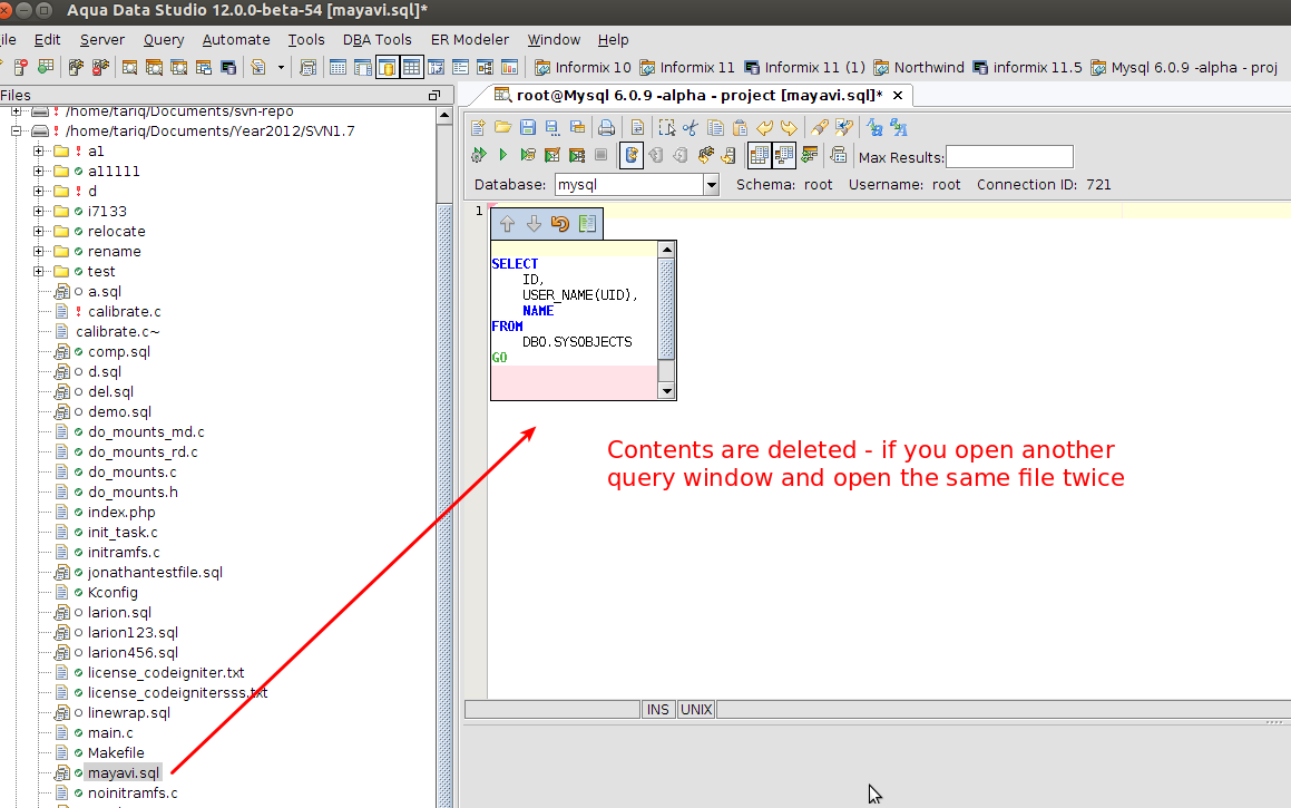 2. Select a SQL file that is under version control (svn)