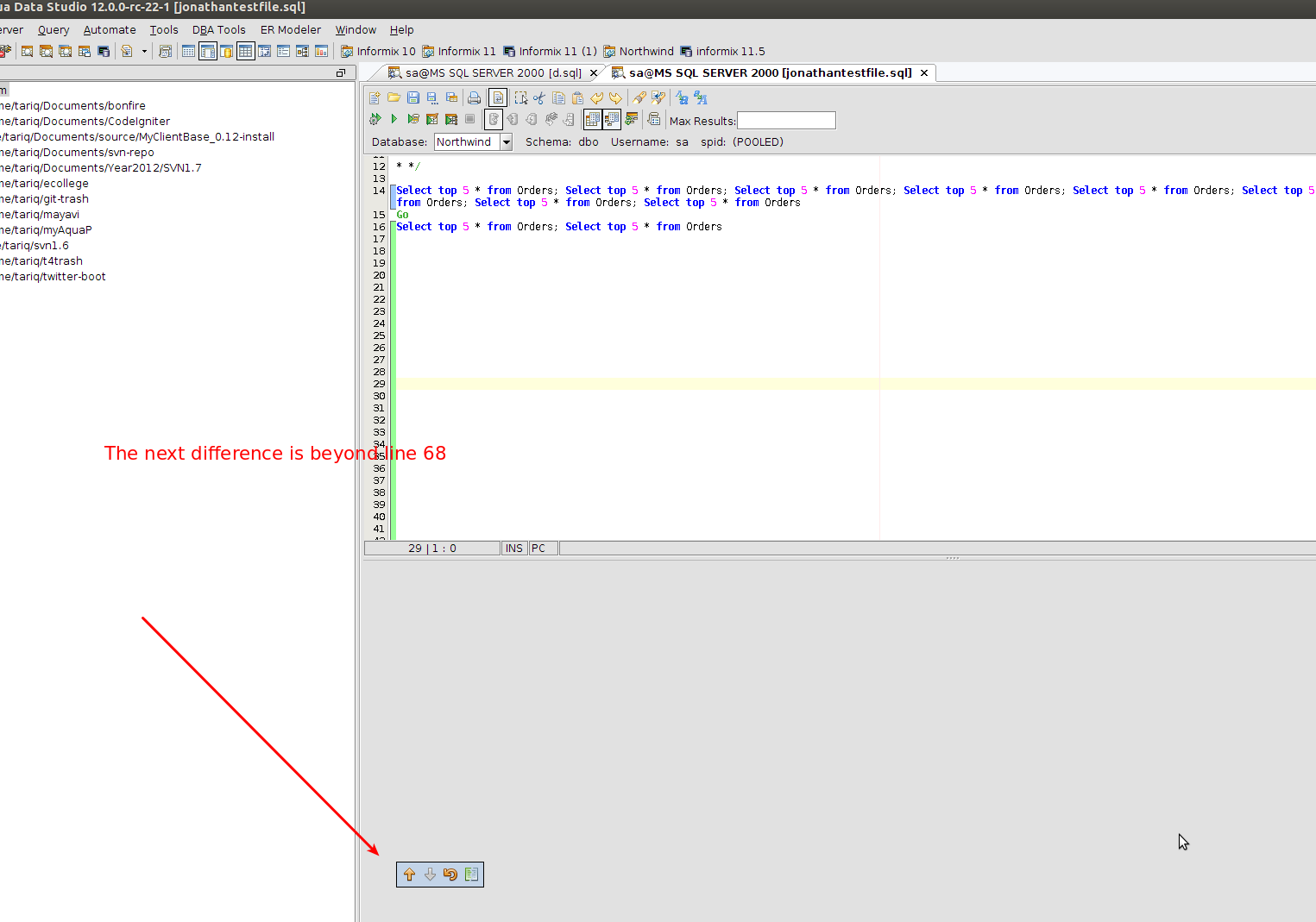 5. in file inline.sql go to line number 21, right click and take the menu and then Go to Next Difference