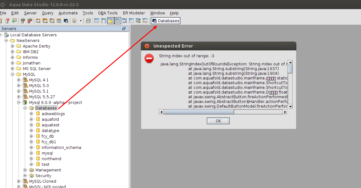 2. Expand the Server Node, Select the node Database and drag and create a Toolbar shortcut. Clicking on it gives below exception