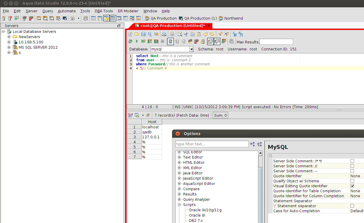 This is probably a JDBC driver specific issue, because I've tested it on ADS with a MySQL connection and both scenarios work as expected (no error). Also, the SQL Log window shows that the comment is not sent to the MySQL server.