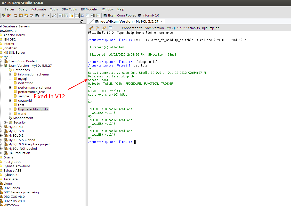 Calling the \sqldump command with the -o file parameter and having descriptive header enabled (either by the default one, either explicitly enabling it with -DH true) results in writing the header twice.