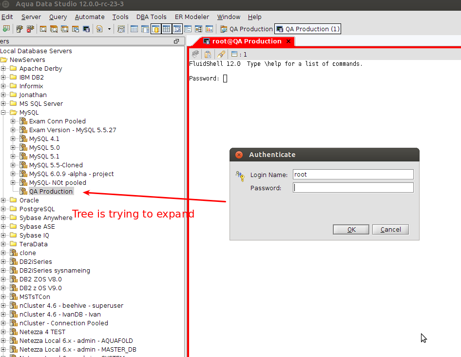 With issue #7496 we made the change that the Tree node should expand while clicking on a FluidShell shortcut. Now if you have a DB Server with no password saved, Password is prompted twice - one for the fluidshell and another for the tree to expand.