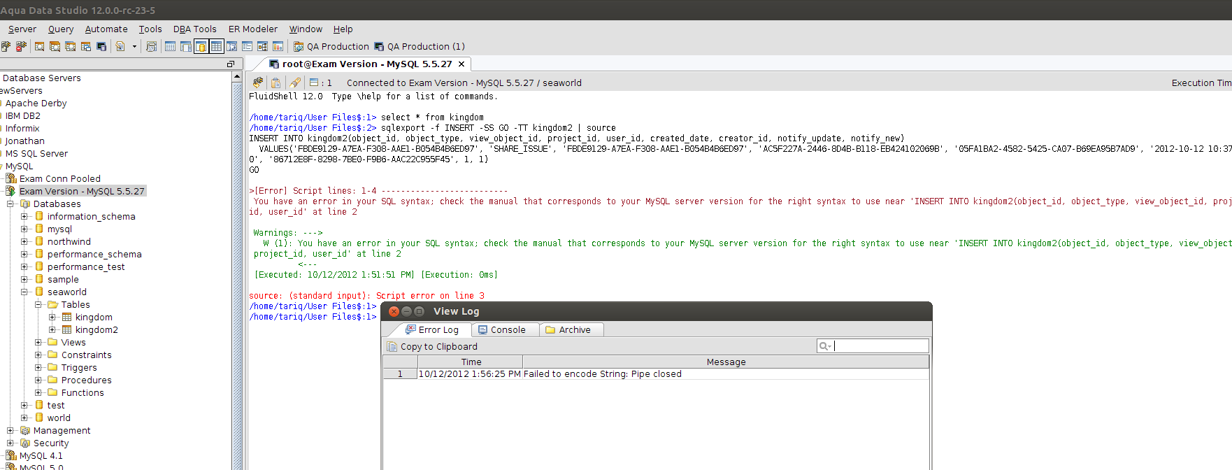To reproduce, open a FluidShell to MySQL 5.5.27 database seaworld ending with host ip 56. change to database seaworld