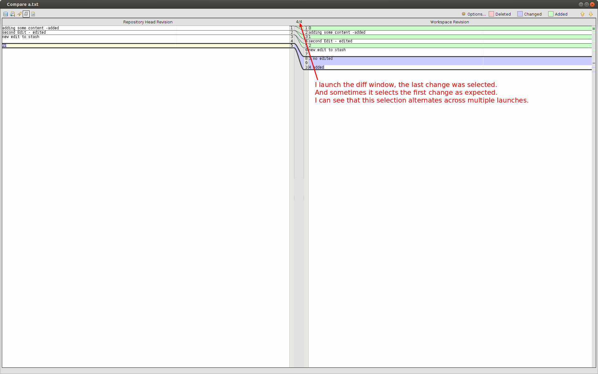 >1. The diff window doesn't always start with the same difference selection.