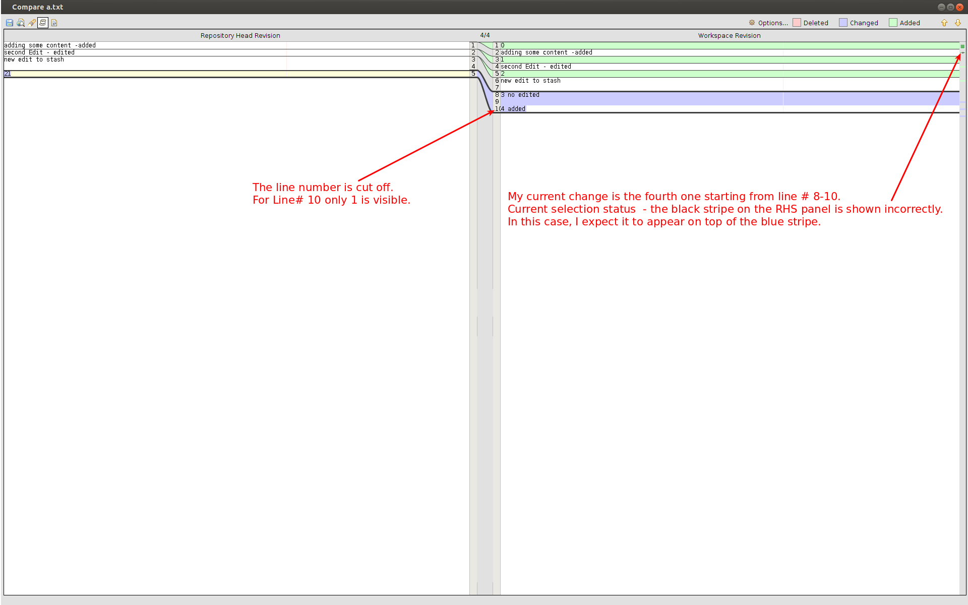Try to compare a file with many differences. Most of the time when we launch the diff screen, status shows the last diff as the current diff position though the highlighting is on the first; Eg: in my case it showed 4/4 but the cursor was at the first difference. And clicking on the RHS marker line to navigate to the difference works as expected but it does not update the status; Eg: I clicked on the third diff marker line and it navigated to the third diff but the status did not change to 3/4.