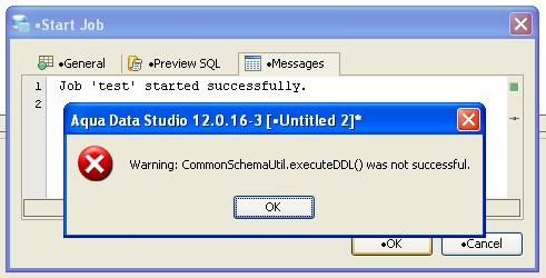From version 11 to 12 we changed how warnings affected the perception of success/failure from CommonSchemaUtil.executeDDL(). We added a warnings tab to most the dialogs but not these 4. Now if you execute sql from one of these 4 tabs and a warning is returned, executeDDL tells commonschemadialog that the execution failed and we display the generic "Warning: CommonSchemaUtil.executeDDL() was not successful." message because we don't know the warnings at this time. There is no warnings tab but the execution was successful.