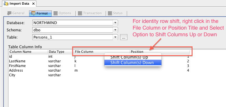 On several occasions I've found myself wishing this feature existed but never got around to requesting it. When importing data from a flat file (CSV in my case) into a database table I have had several occasions where the database table has an identity column (SQL Server) but the flat file does not. When the second import screen pops up you can alter the position where each of the flat file fields get imported into. So, in my case, I just shift each one by 1. In other words, the first field which shows Position 1, I remove that position and then start with Position 1 from the second field. The import works flawlessly doing this but it is a hassle when you have a large number of columns and have to change the numbering on each one by one. I would love to see a feature to "renumber" or "shift" the fields in bulk. I envision this as either a right click function when clicking on the position cell or the position header but leave the design up to you :)