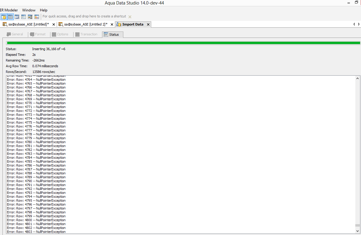 Now go to Tools->Import Data->Connect to Sybase ASE 15.7->Import file(Use attached file),click next->From Schema and table drop down select respective values(above given table) and click next->In option tab from "Destination" drop down->choose "Import into database",click on next button->On Transaction tab set Transaction type:Batch,Batch size:1000,Threshold:0and wait time-1 and say next.This will throw error message over ADS window console.