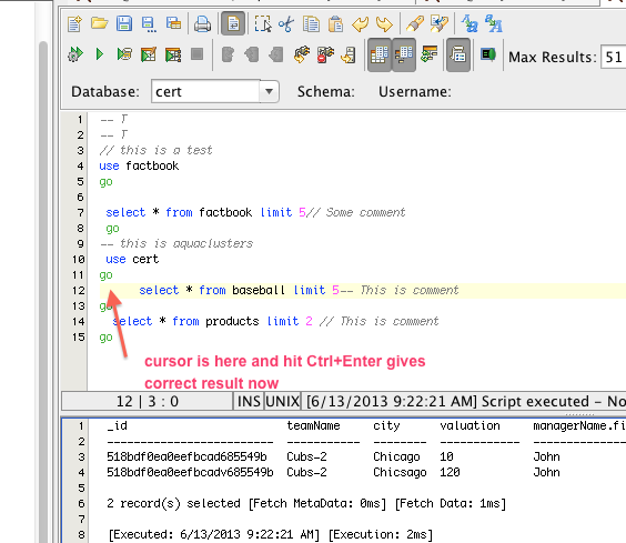 A script is broken up into multiple statements by a statement separator. If the "--" or "//" are configured as a client side comment and a user used a client side comment in a statement, the end character count of that statement would be augmented by 1 incorrect count. This would effect the starting character count of any subsequent statements. This is now fixed in :