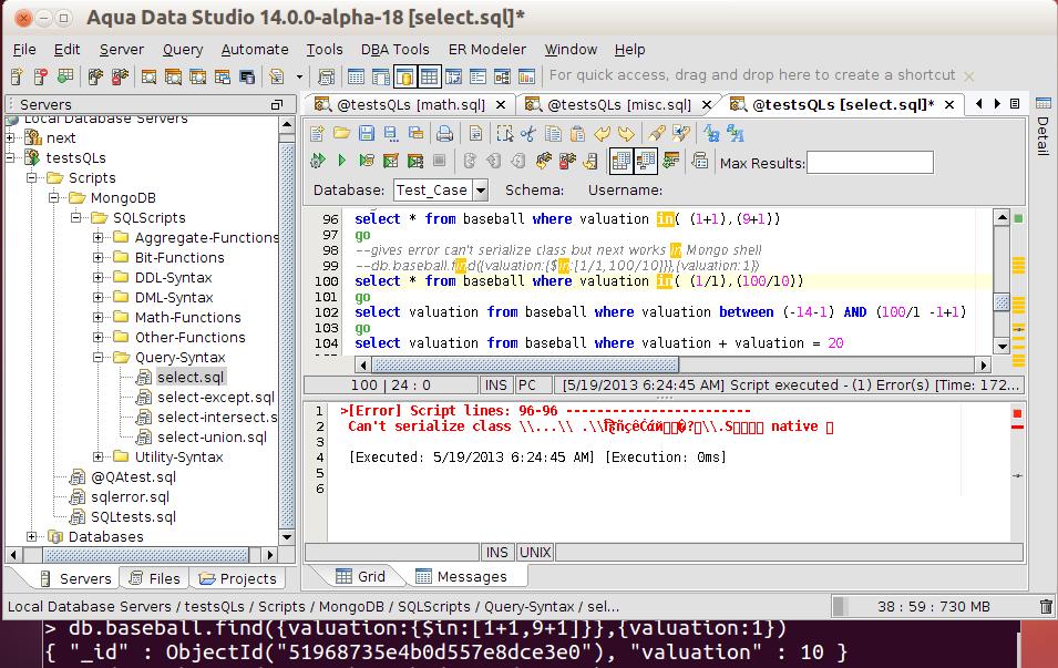 Verified in Aqua Data Studio Aqua Data Studio 14.0.0-beta-68 Build #: 33238 on Ubuntu 12.04( Mongo DB 2.4.3) and Windows XP ( Mongo DB 2.0.9).