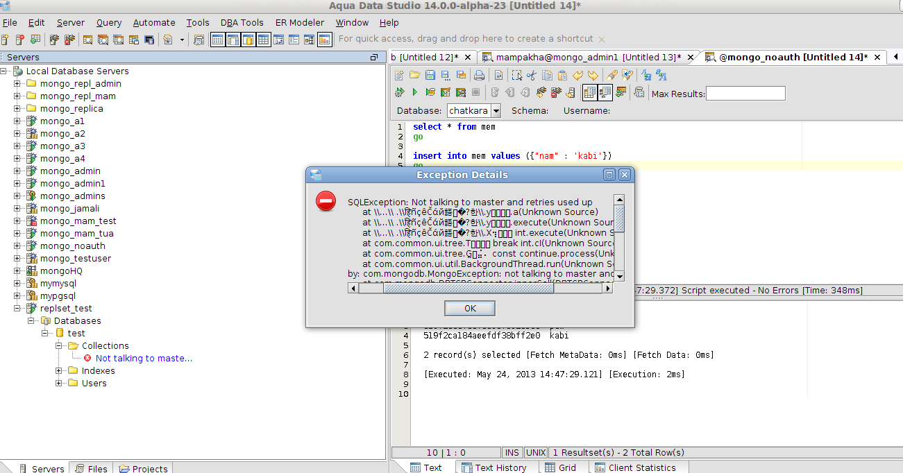 1) Now if we just specify secondary member server/port information on 'Register Server' window and try to connect, the DB objects (Collections, Indexes etc) are not displayed saying 'Not talking to master'. (Pls refer to replset_secondary_exception.png) This should not be the case. Even if just a single secondary member or subset of members of replica set are specified, ADS should intelligently garner primary member information using db.runCommand('isMaster') (or similar command) and connect to it.
