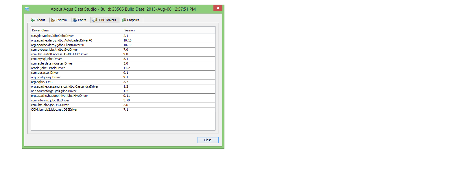 Product: Aqua Data Studio Version: 14.0.0-beta-80 Build #: 33506 Build Date: 2013-Aug-08 12:57:51 PM Operating Environment: Windows 7 (6.1, amd64) / Cp1252 / en / US / Sun Microsystems Inc. 1.6.0_43-b01 Memory: Max=891,092,992; Total=384,696,320; Free=327,651,848; CPUs=4