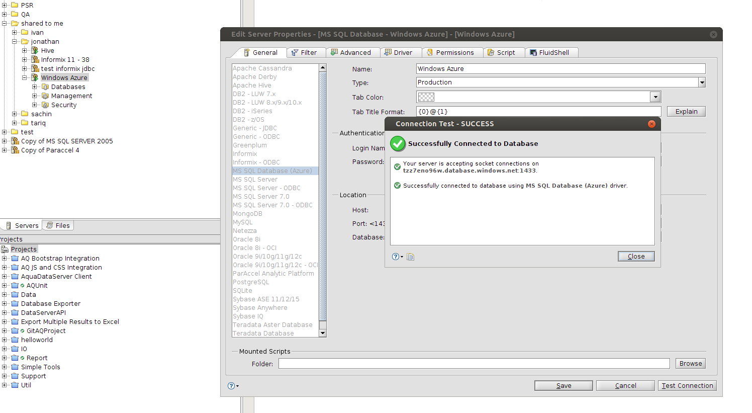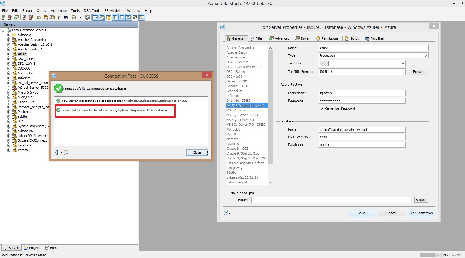 In the latest build Error message for Successful test connection in case of Azure and SQL Server is wrong. See attached screen shot