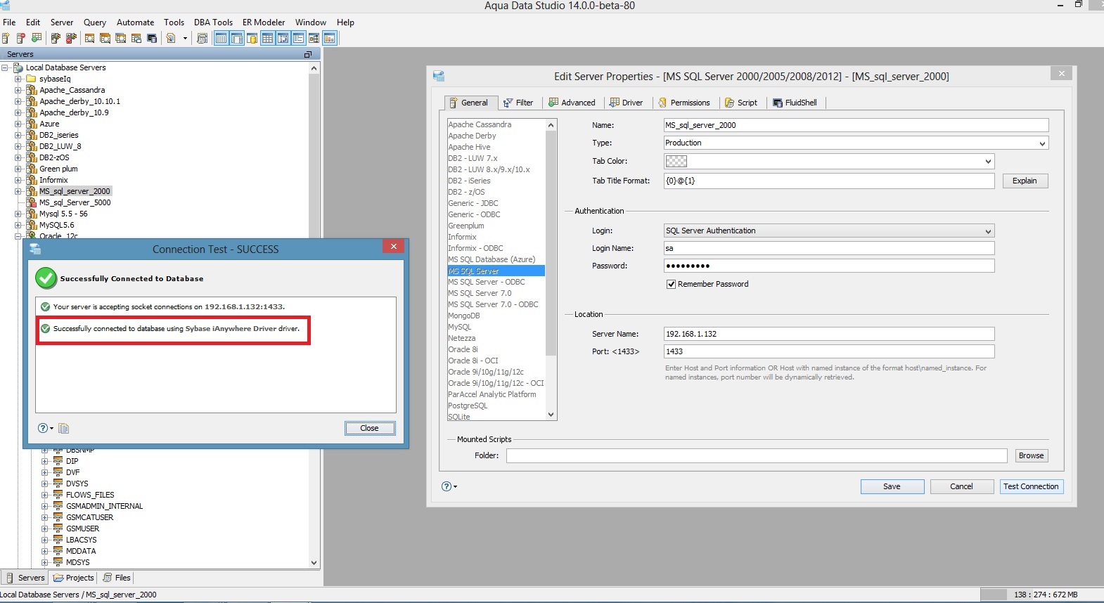 4) Click Test Connection, it shows the message saying connected using iAnywhere driver though it is not using it.