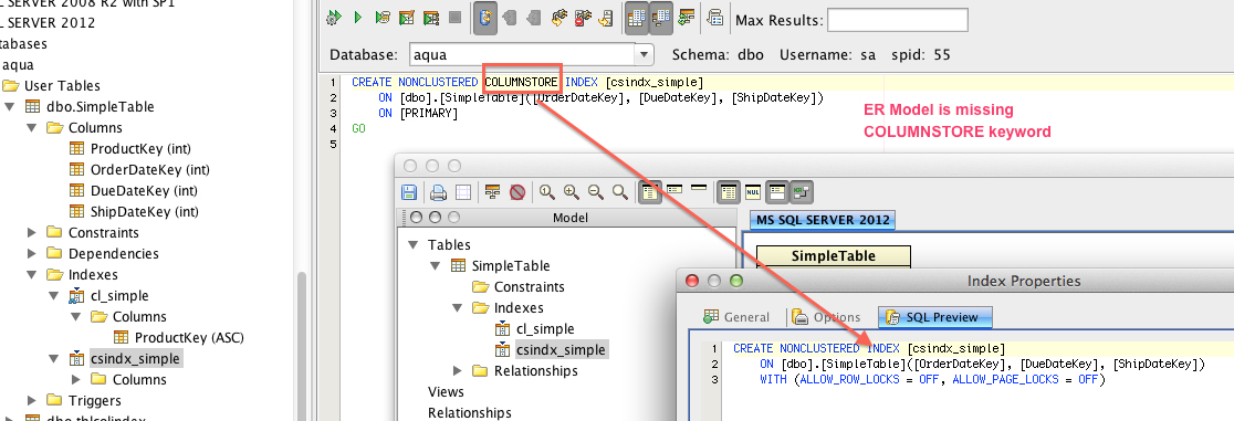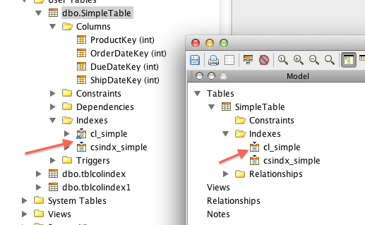 2. Use Tools-> ER Diagram Generator to script the table with COLUMNSTORE. In the ER Model, the icons for indexes are different. (See attached pic 1)