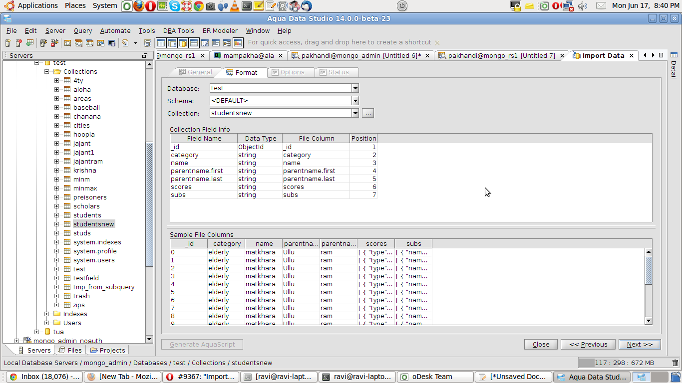 2) Now we import this file into a newly created collection named 'studentsnew' using 'Tools->Import Data' (default settings)